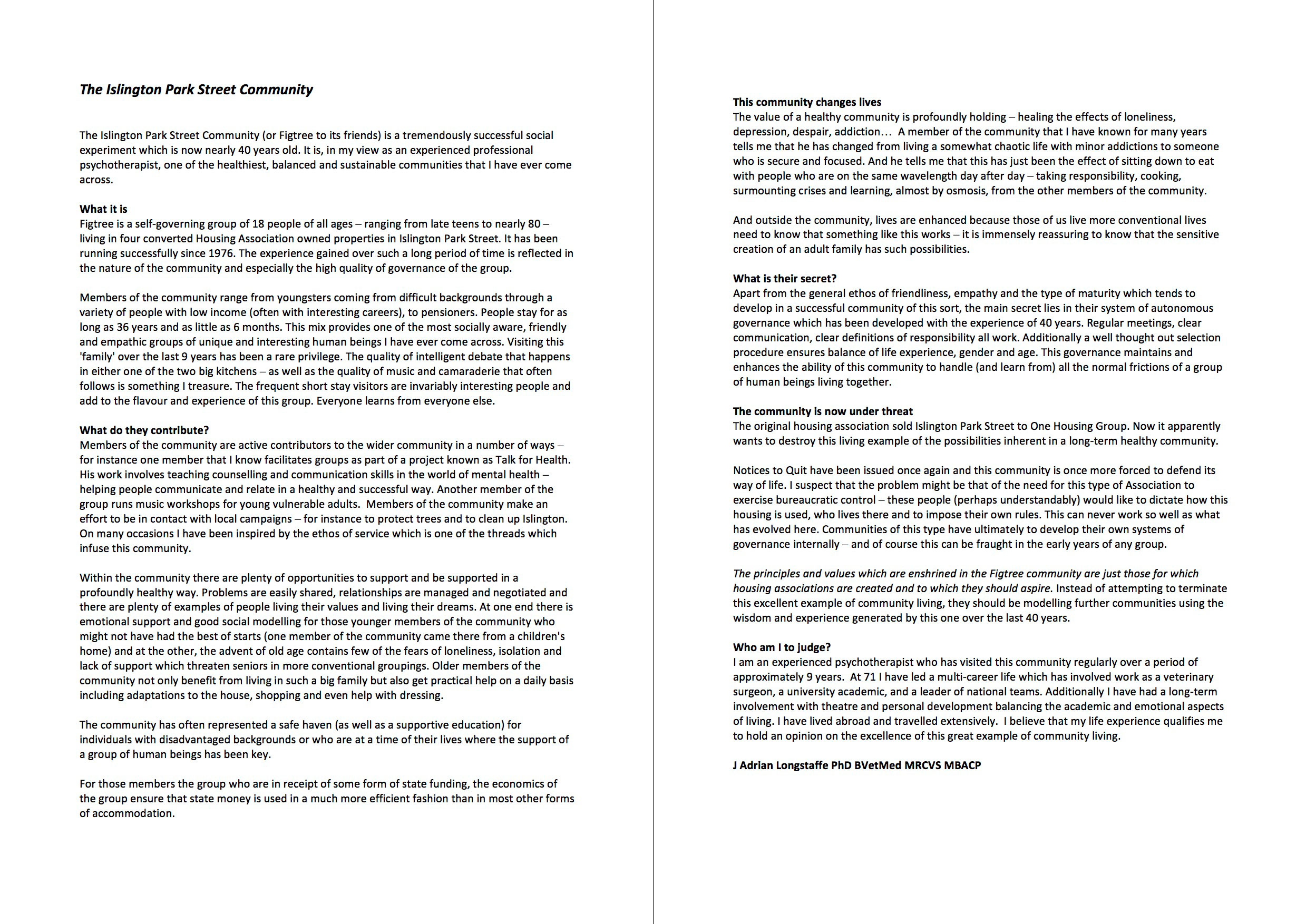 Islington Park St Community is a group home consisting of 18 single adults with mixed needs. We have no overriding philosophy apart from our desire to live communally.