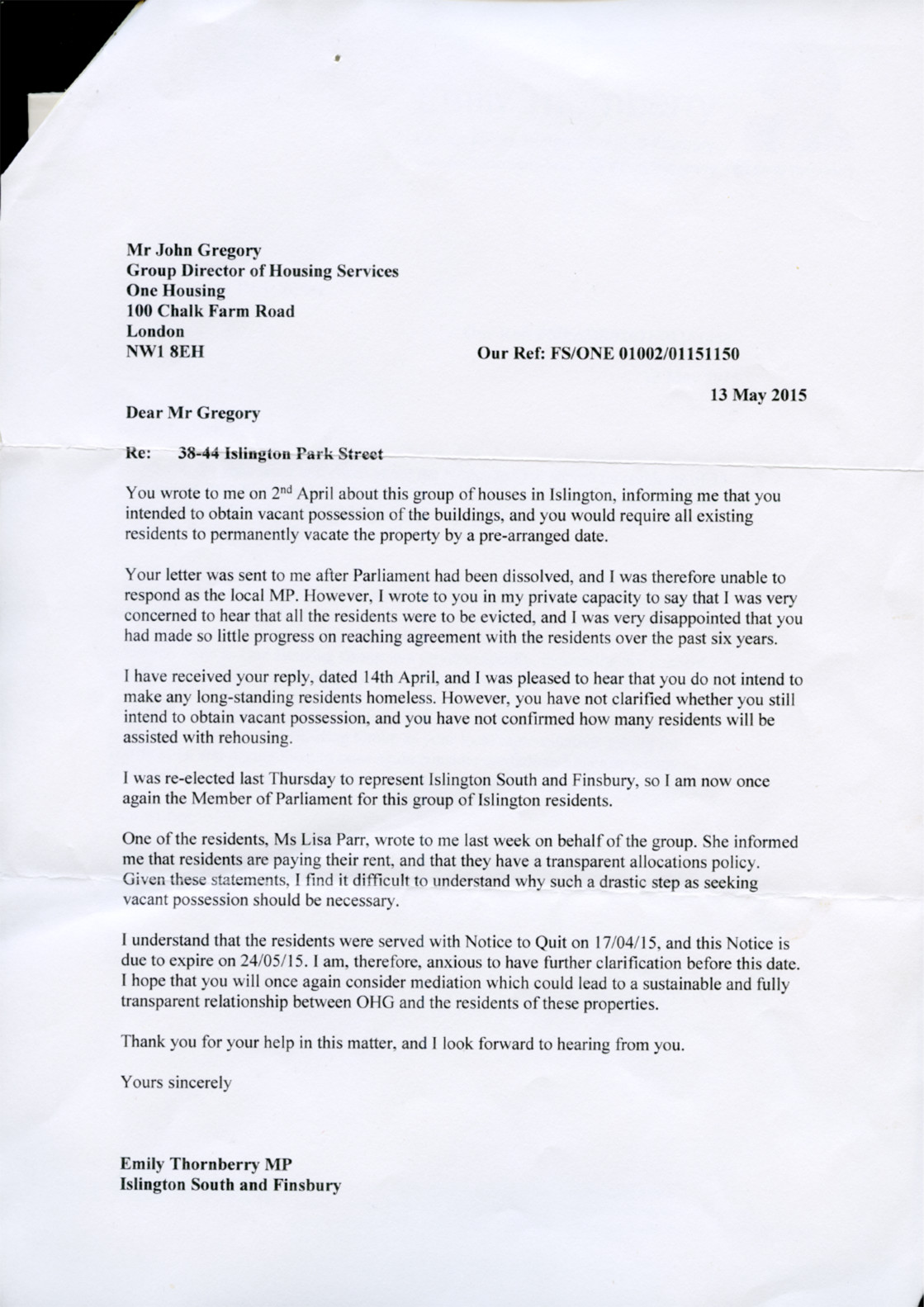 Letter from Emily Thornberry MP to John Gregory, Group Director of Housing Services at OHG, 23rd of May 2015